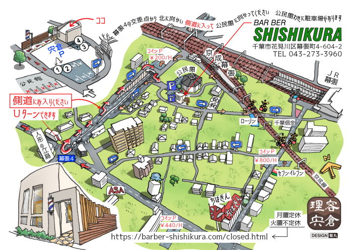 住宅街なので、京成線幕張駅または幕張公民館を目印にしていただくとわかりやすいと思います。
